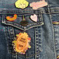 Jazz up your jacket with this acrylic pin. Retro colour scheme flowers drawn by myself with a 1960s style font.